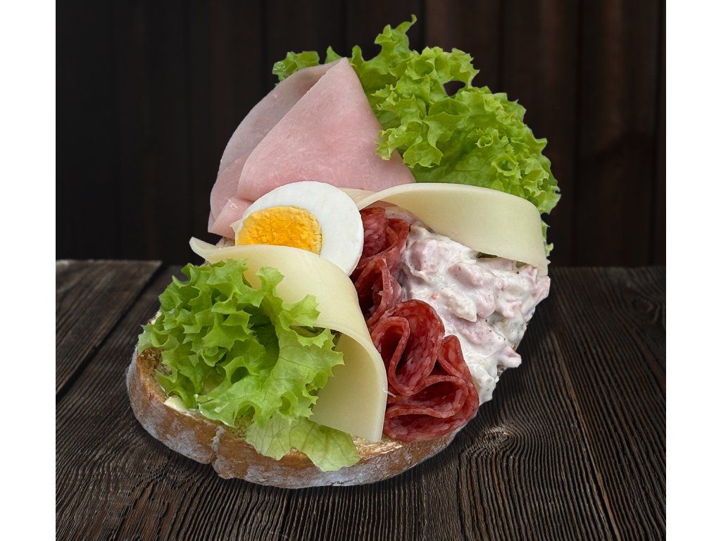 Zloženie : pečivo, zemiakový šalát, bravčová šunka, vajíčko, saláma Nitran,  syr Eidam, čerstvá sezónna zelenina