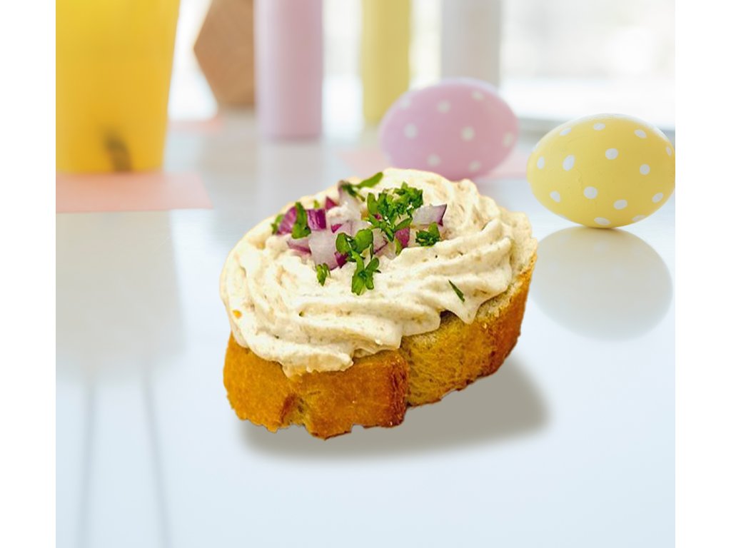 Zloženie: pečivo, škvarková nátierka, červená cibuľka, čerstvé bylinky