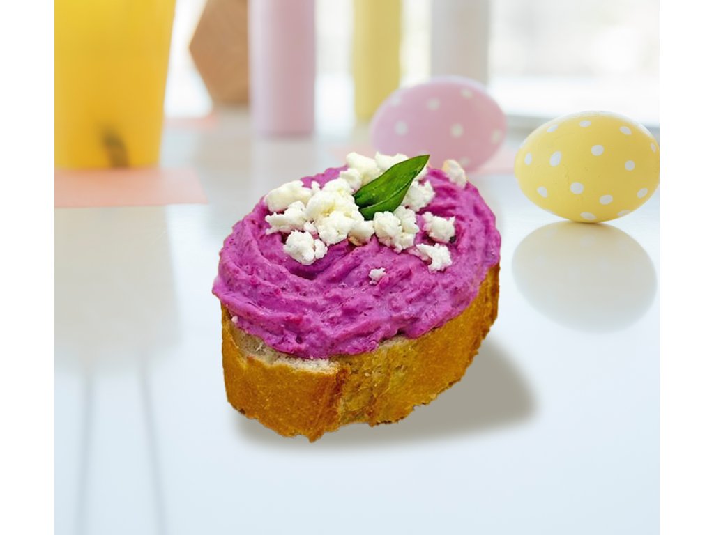 Zloženie: pečivo, cviklová nátierka, balkánsky syr, jarná cibuľka
